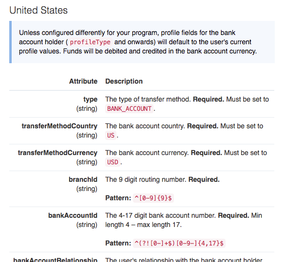 In addition to listing country-specific required and optional attributes in the direct deposit documentation on the Developer Portal, we are now also adding regular expression patterns. If you choose to build your own UI for collecting transfer method details (like banking information), you can take advantage of the regular expression patterns we provide and create your own field validation to match the bank’s requirements. See the example screenshot snippet below, with the API direct deposit information for the United States.